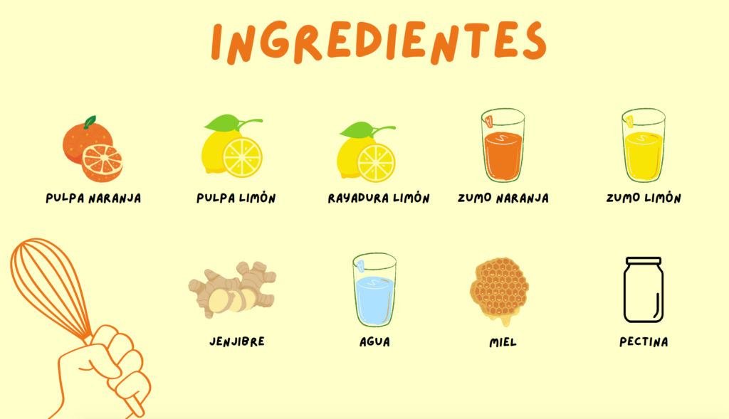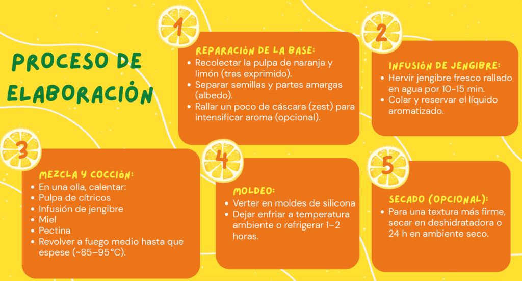 4. Mezcla y cocción: En una olla, calentar la pulpa de los cítricos, la Infusión de jengibre, miel, pectina. Remover a fuego medio hasta que espese.