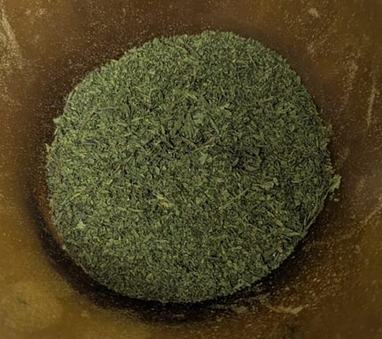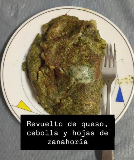 Secar las hojas de zanahoria en el horno y triturarlas hasta obtener un polvo. Con este polvo, se ha preparado un revuelto al que, además, se ha incorporado queso y cebolla.